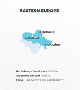 - Eastern Europe has highly trained developers, but at a higher price and smaller, more competitive pool.
