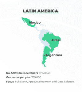 With special focus on full stack development, app development, and data science, Latin America is often a second hub for many companies wanting high level, quality developers at a lower cost.