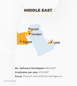 The Middle East is a bit late to the outsourcing game, and thus is still lagging behind where they should be as far as talent pool given their population. However, given the recent surge in tech investment at both a university and entrepreneurial level, this is bound to increase.