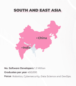 Being home to the most populous and most densely populated region in the world, one would expect it to have a larger talent pool than it currently has. This problem has already been recognized and put to work by the countries in this region. For example, in the Philippines, there is a pool of 95,000 developers, which is small compared to India and China. But they are graduating 130,000 IT graduates a year, which means that the talent pool will grow exponentially in the upcoming years.
