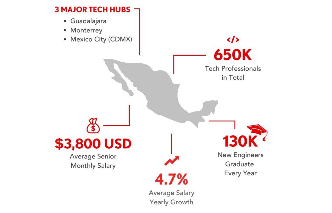 Mexico has 3 major tech hubs where the majority of its 650,000 developers are located. These cities also graduate more than 130,000 engineers every year and they come from very renowned universities in Latin America like UNAM, IPN, Tec de Monterrey, Universidad de Guadalajara, and others. The average yearly salary nationwide is 46,000 USD.